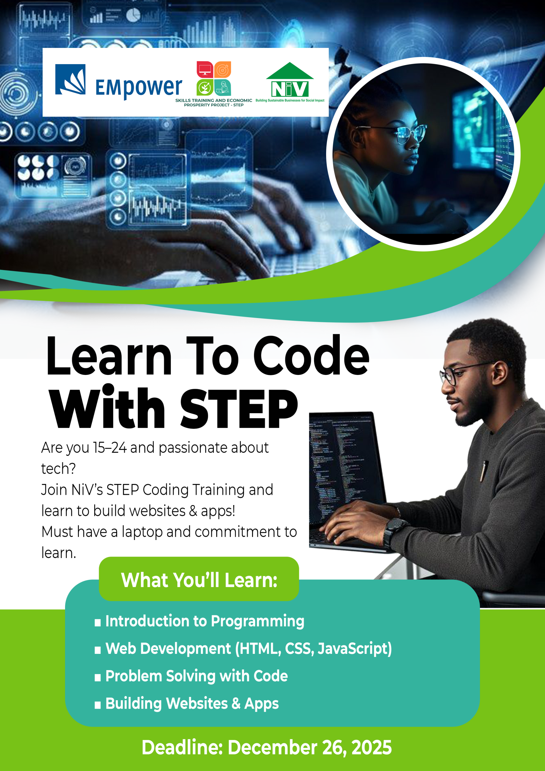 The program is open to youth aged 15–24 who are passionate about technology and eager to learn. Whether you dream of building websites, designing apps, or simply exploring how code can solve real-world problems, STEP is here to guide you.